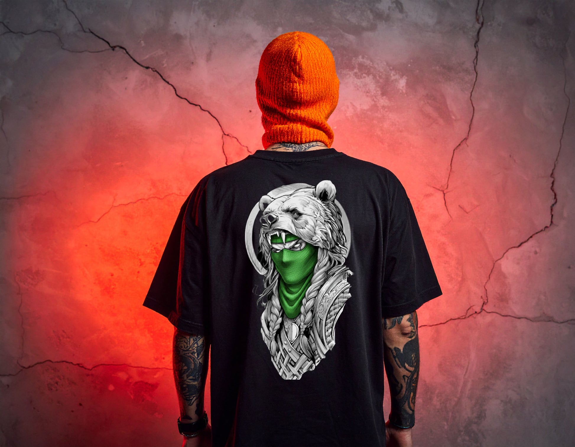 This cotton short-sleeve shirt features a striking design inspired by armor around the neck and shoulders, lending it a fierce, warrior-like presence. Sharp, metallic-like lines carve through the fabric, while a vivid red bandana stands out boldly against a black background, evoking blood on a ritual stone. Perfect for those who want to wear their strength and daring spirit visibly.