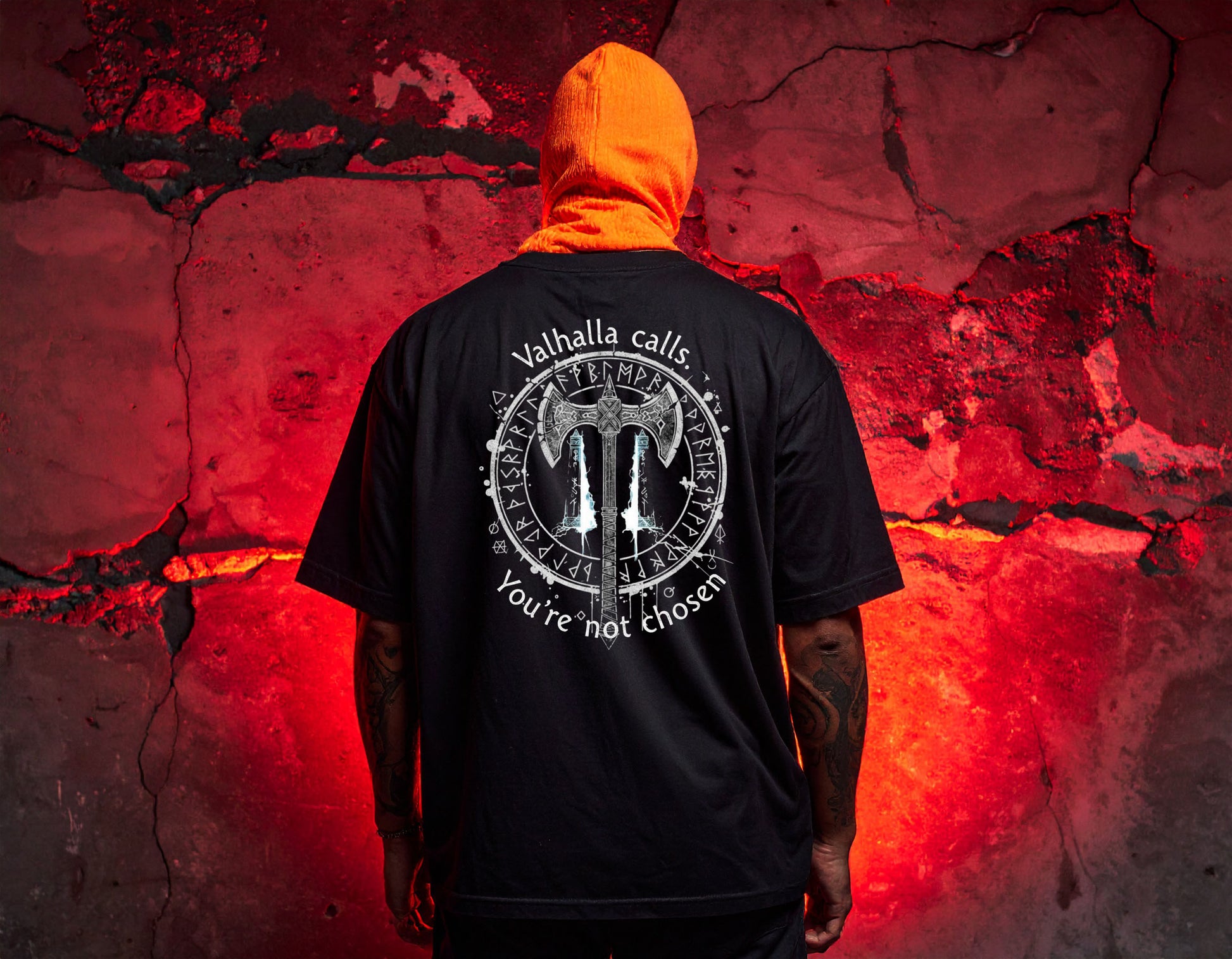 This bold black oversized cotton shirt features a striking circular emblem on the back, adorned with runic inscriptions. At its center, a stylized hammer or "T" symbol evokes Thor's power. The phrases "Valhalla calls" above and "You’re not chosen" below highlight a mythic tale of selection—celebrating the outsider who chooses themselves rather than being chosen. Wear this shirt to embody strength, defiance, and self-determination.