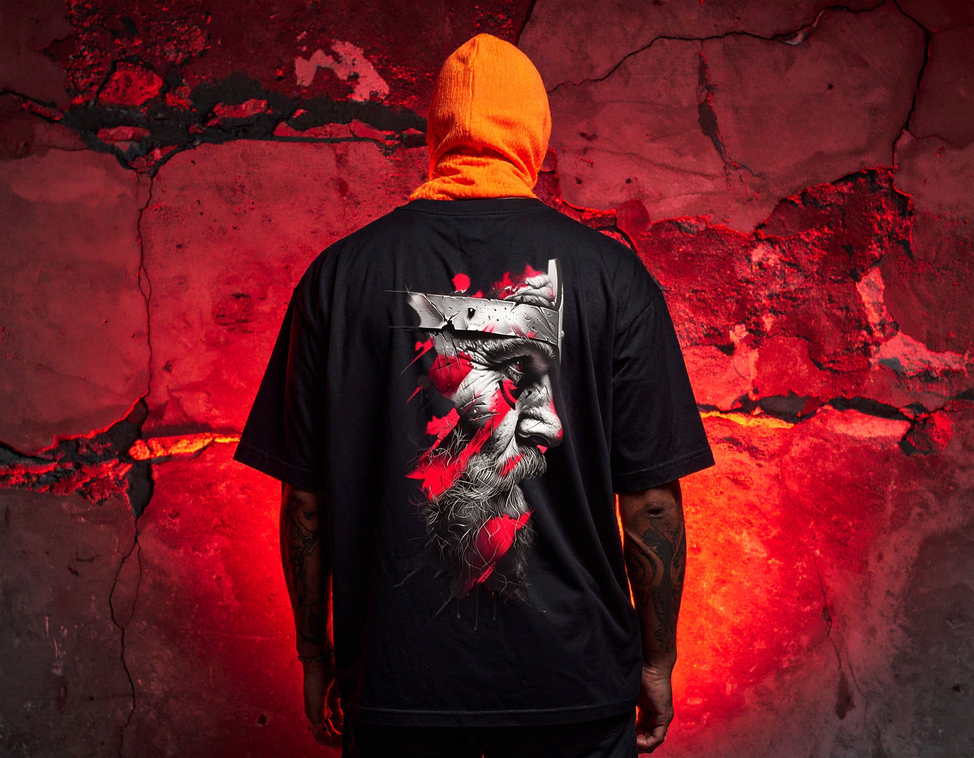 This black oversized cotton shirt boldly displays a grayscale portrait of a bearded man crowned like a fallen king. Striking red streaks cut through the design, resembling blood or ritual paint, symbolizing an outsider’s claim to power beyond the throne. Perfect for those who challenge authority with style and attitude.