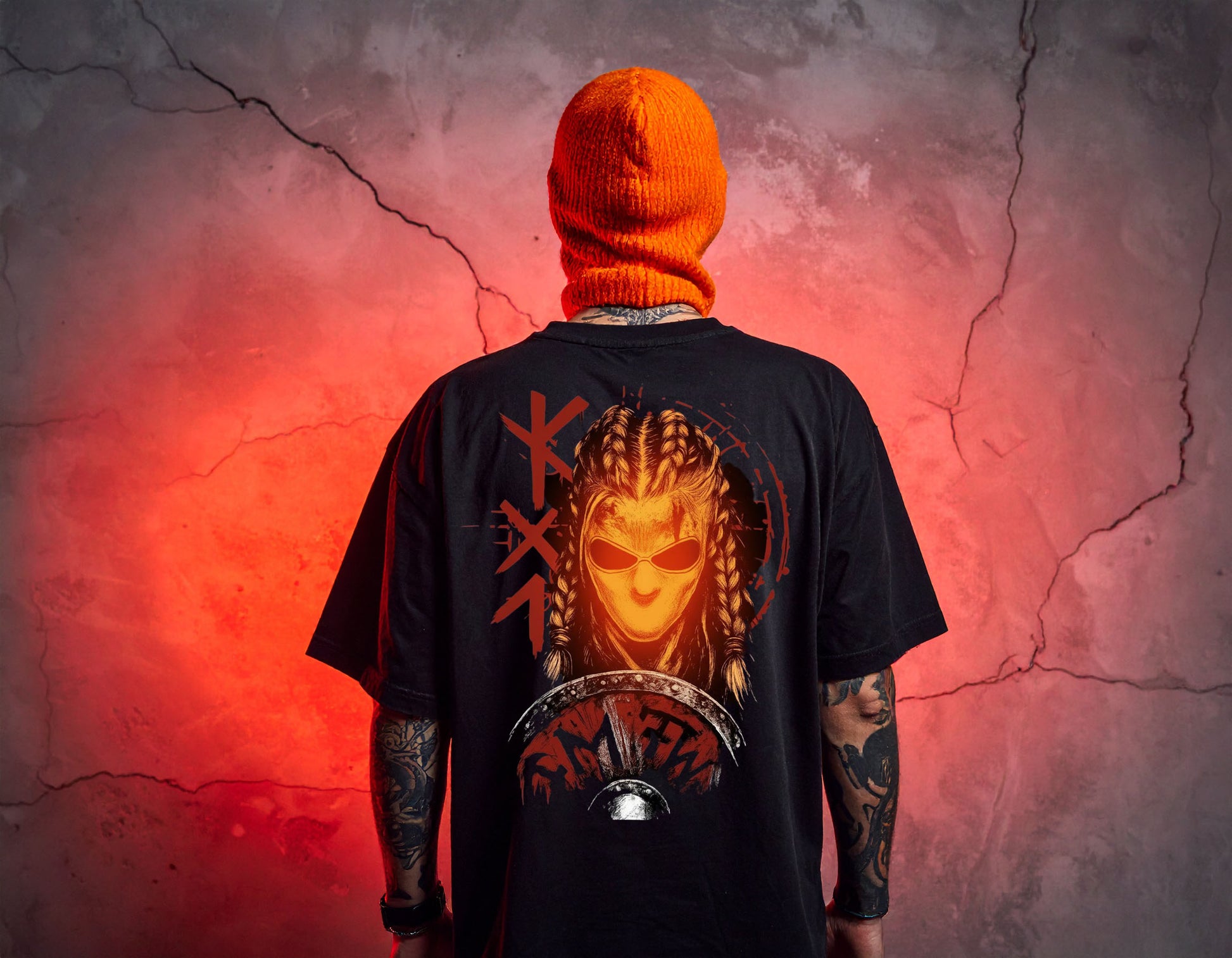 This black oversized cotton shirt features a striking design of an outsider's face in glowing yellow-orange hues, braided hair, and dark sunglasses resembling a ritual mask. Encircled by enigmatic red symbols and codes, it evokes a mysterious, otherworldly aura. The bold "STAY FLY" arching below completes this daring fusion of mythology and cyberpunk, perfect for those who defy convention and embrace the unknown.