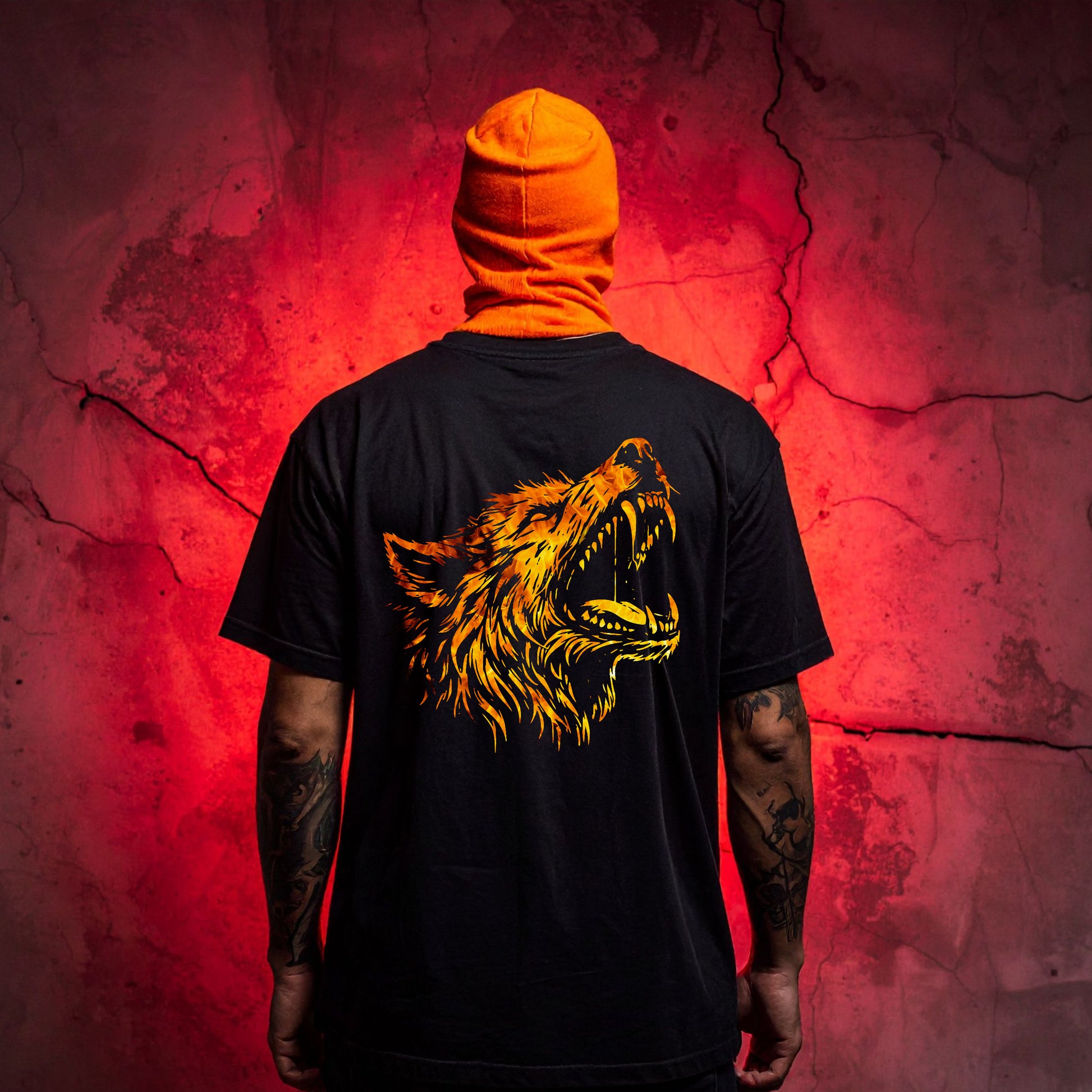 A feral wolf’s head bursts from the back of the shirt in orange and yellow tones — teeth bared, eyes blazing. The graphic radiates raw energy, framed by the wearer’s orange balaclava and tattooed arms. The cracked red wall behind adds to the intensity, making the figure feel like a lone warrior in a mythic wasteland