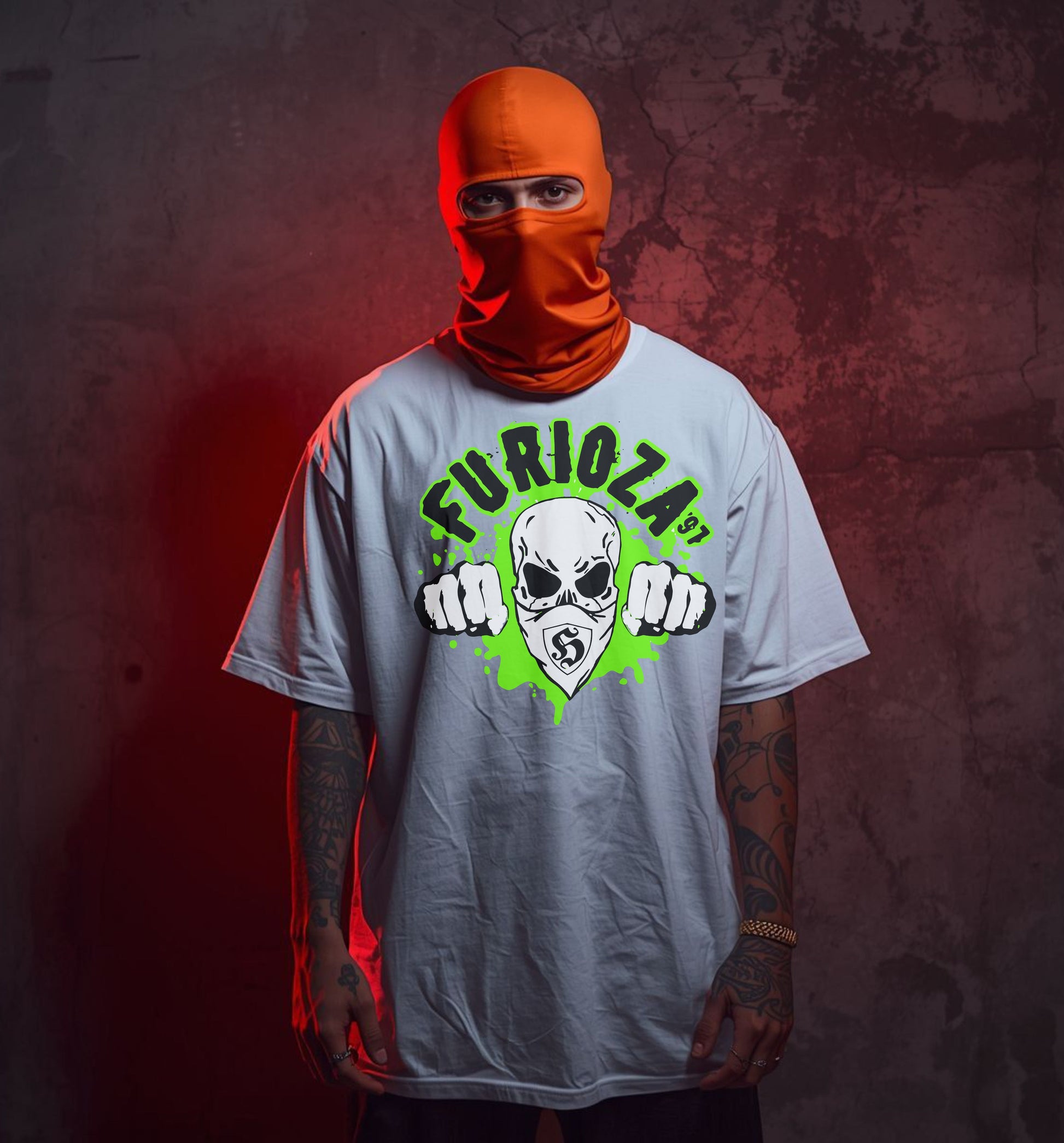 The design features a menacing skull with clenched fists punching forward, radiating aggression and defiance. Above the skull, the word “FURIOZA” is printed in large, distressed black letters, evoking raw energy and underground rebellion. To the side, the number “97” appears in bold green, possibly referencing a year, crew, or symbolic code. Behind the central figure, a green splatter effect adds intensity and motion, amplifying the chaotic, street-fighter vibe. The skull’s expression is fierce, almost warlike—its clenched jaw and hollow eyes channel fury and resistance