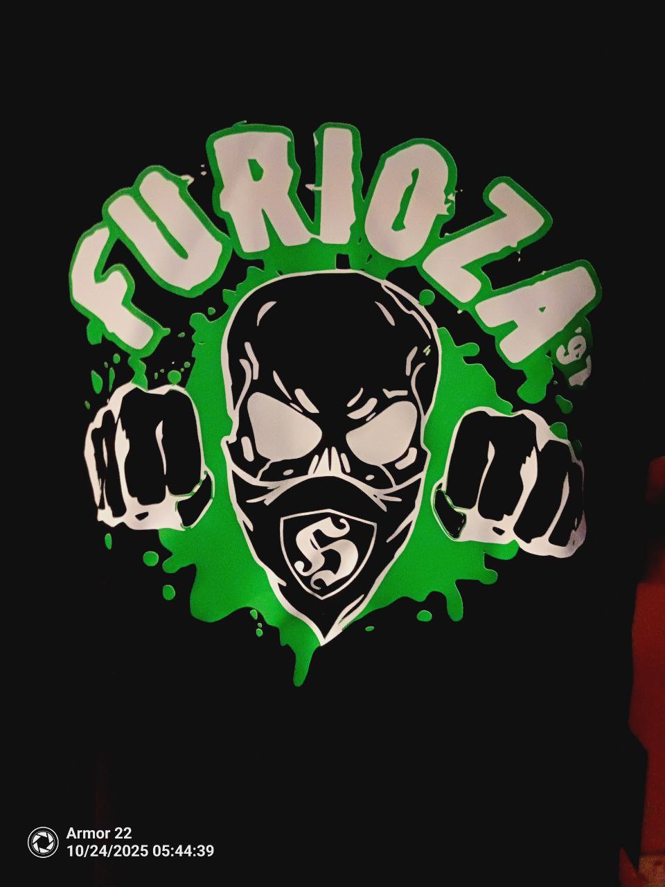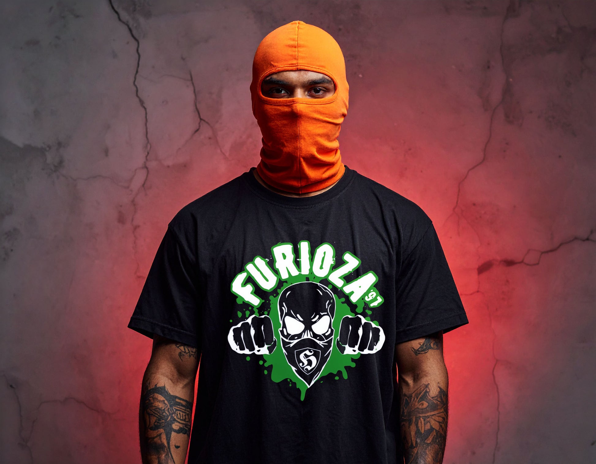 The design features a menacing skull with clenched fists punching forward, radiating aggression and defiance. Above the skull, the word “FURIOZA” is printed in large, distressed black letters, evoking raw energy and underground rebellion. To the side, the number “97” appears in bold green, possibly referencing a year, crew, or symbolic code. Behind the central figure, a green splatter effect adds intensity and motion, amplifying the chaotic, street-fighter vibe. The skull’s expression is fierce, almost warlike—its clenched jaw and hollow eyes channel fury and resistance