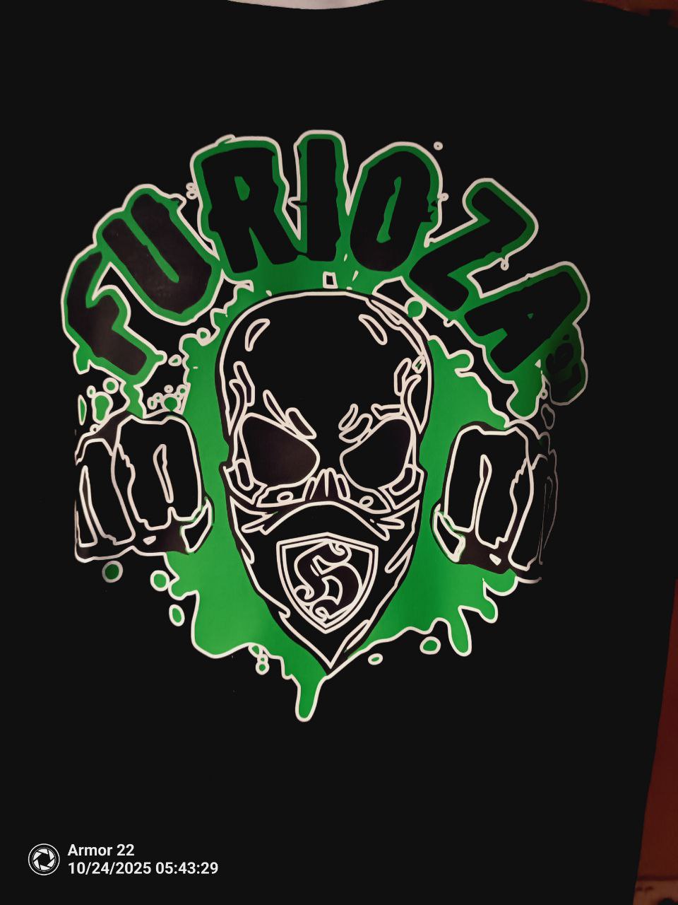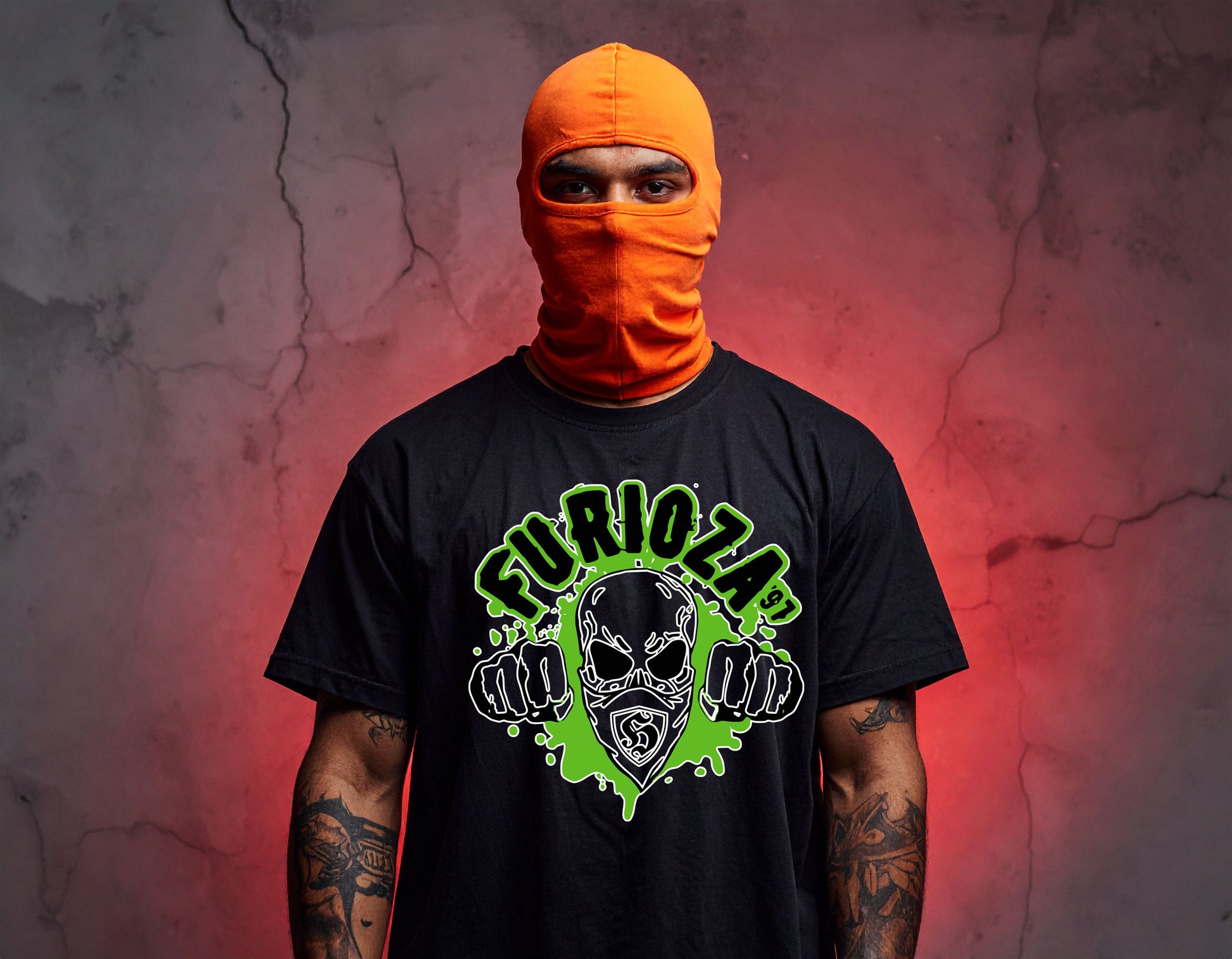 The design features a menacing skull with clenched fists punching forward, radiating aggression and defiance. Above the skull, the word “FURIOZA” is printed in large, distressed black letters, evoking raw energy and underground rebellion. To the side, the number “97” appears in bold green, possibly referencing a year, crew, or symbolic code. Behind the central figure, a green splatter effect adds intensity and motion, amplifying the chaotic, street-fighter vibe. The skull’s expression is fierce, almost warlike—its clenched jaw and hollow eyes channel fury and resistance