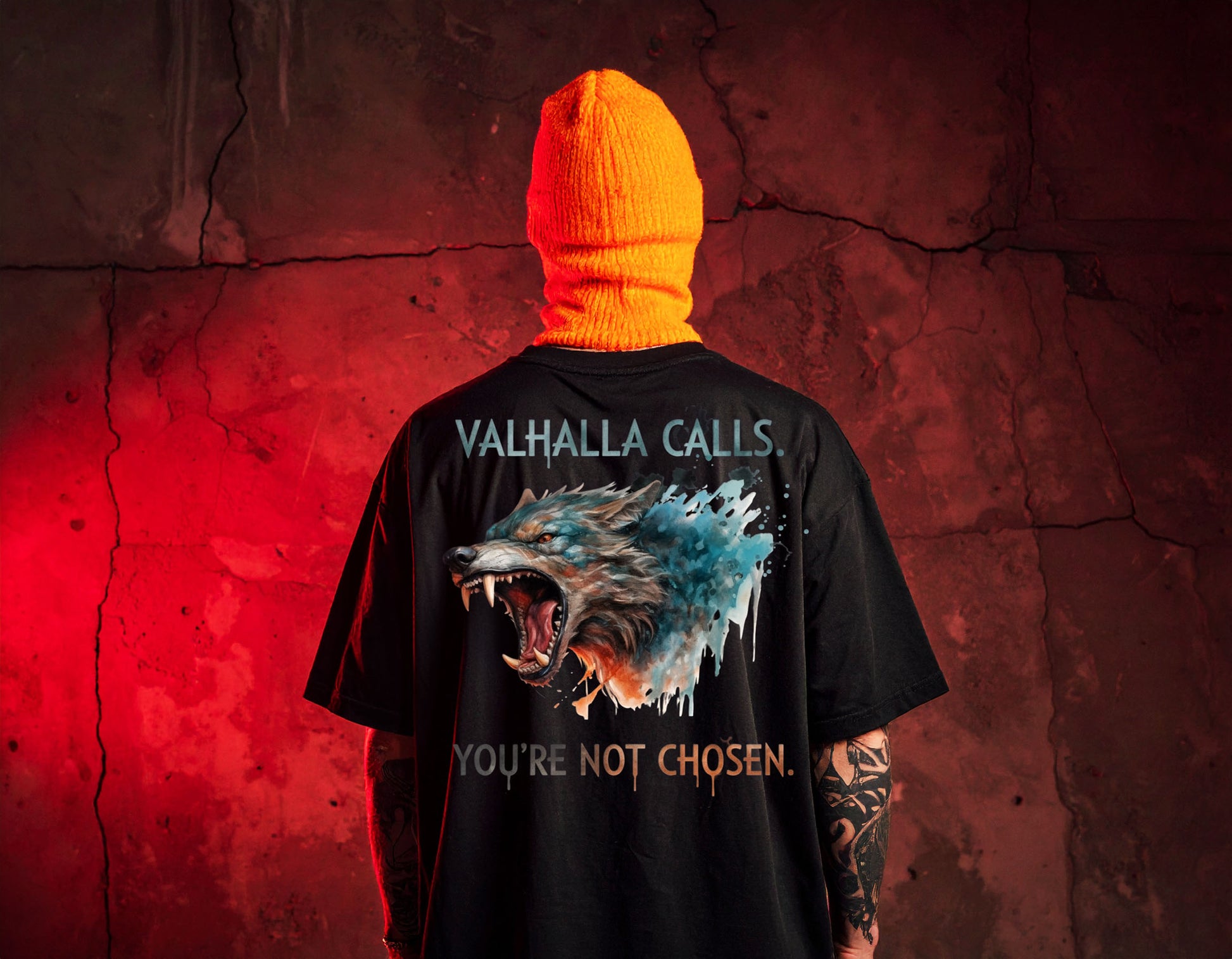 This striking cotton short-sleeve shirt boldly channels a fierce, rebellious spirit. Featuring a vivid graphic of a snarling wolf bursting through the fabric in deep blues and grays, it commands attention with the mythic call, "VALHALLA CALLS." The defiant phrase “YOU'RE NOT CHOSEN” below adds an uncompromising edge for those who march to their own beat. Crafted for comfort and attitude, this shirt is perfect for standing out and embracing your untamed side.
