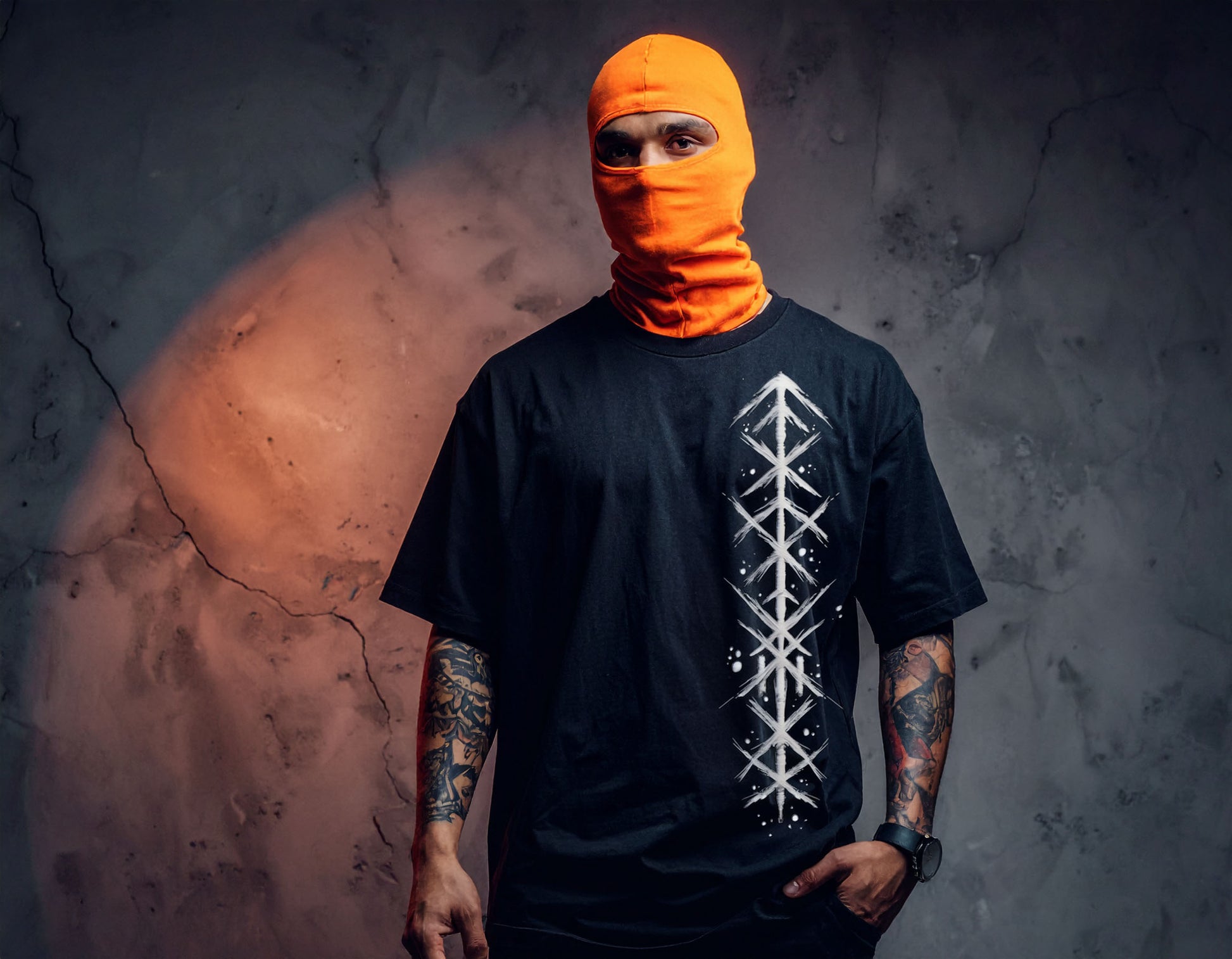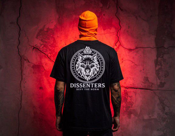 DISSENTERS — Ritual Tee This bold cotton shirt features a vertical sigil on the chest, a powerful multi-layered talisman. At the top, it channels Divine energy, followed by broad forms symbolizing Strength. The central element drives fearless Courage, while flowing shapes below boost Health & Vitality. Finally, a grounding motif offers solid Protection. Visible up close and striking from afar, the full-back wolf seal and the motto DISSENTERS / DEFY THE NORM boldly proclaim your daring spirit.