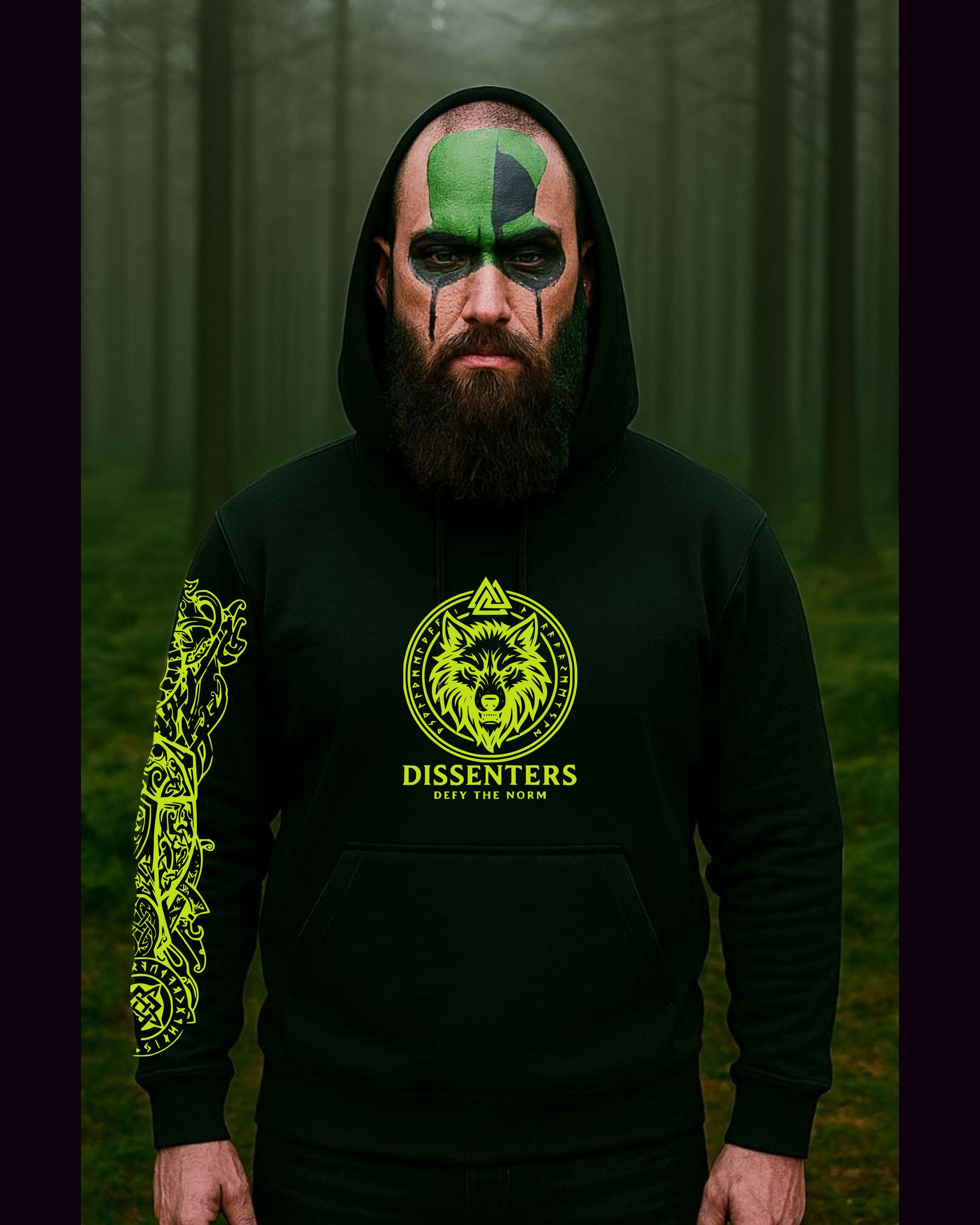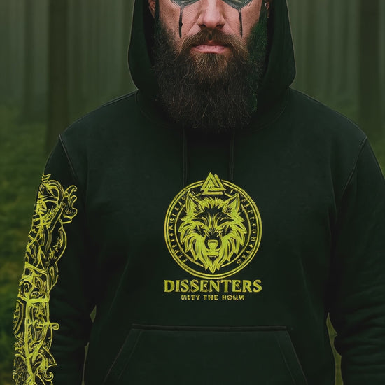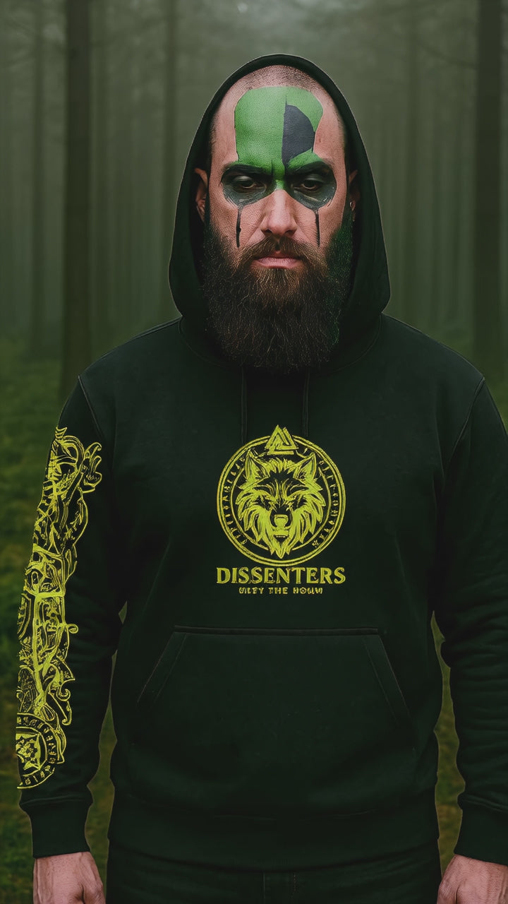 Black heavyweight hoodie featuring a striking yellow bird with expansive wings at its centre, surrounded by intricate geometric symbols that speak to ritual and rebellion. The chest displays a crimson circular emblem—a geometric seal layered with cryptic markings that transforms the wearer into something more than an observer. Down the sleeve runs a vertical stripe of red symbols, a warrior's code etched into fabric. Crafted from 350-gram heavy cotton for durability and presence. This is apparel for those who command attention through authenticity, who refuse to soften their edges or apologize for their power.